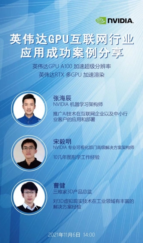 2021年11月6日,GPU发明者&AI计算引领者NVIDIA(英伟达)举办GPU技术主题研讨会,邀请三维家3D产品总监曹健进行家居行业应用成功案例分享。