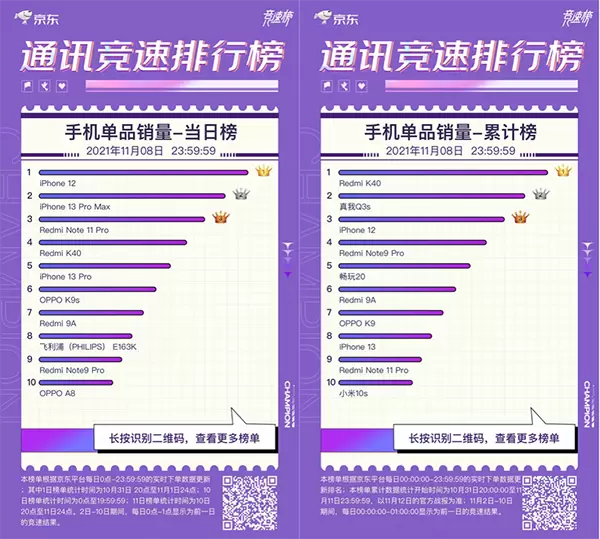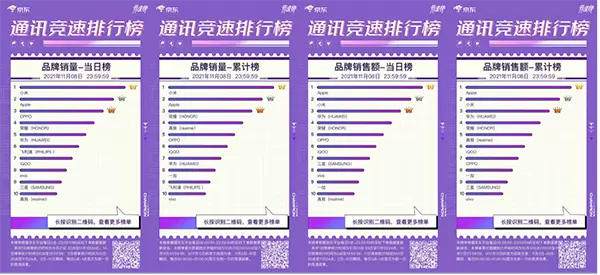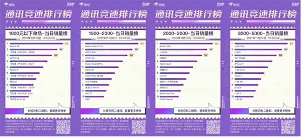 为给用户更巴适的购物体验,京东11.11竞速榜还推出了不同价位的单品榜供用户参考。在1000元以下单品中,Redmi 9A霸占榜首,飞利浦E163K、OPPO A8、飞利浦E527、Redmi 9包揽二到五名;1000-1500价位中,Redmi Note9 Pro成为最受欢迎的手机型号,荣耀play5T次之,Redmi Note 9则斩获季军;1500-2000价位,Redmi Note 11 Pro位列榜首,OPPO K9s一跃成为榜眼,OPPO K9获得季军;2000-3000价位,Redmi K40毫无疑问成为第一。不同于低价位档,高端价位的争夺更为激烈,小米11 Pro强势拿下3000-5000元档位榜首,iPhone 12成为5000-10000元档位的销冠,华为Mate X2持续霸占10000以上单品榜首。