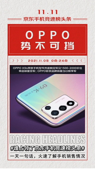 实力过硬 OPPO K9s获得京东11.11竞速榜1500-2000元价位单品销量亚军