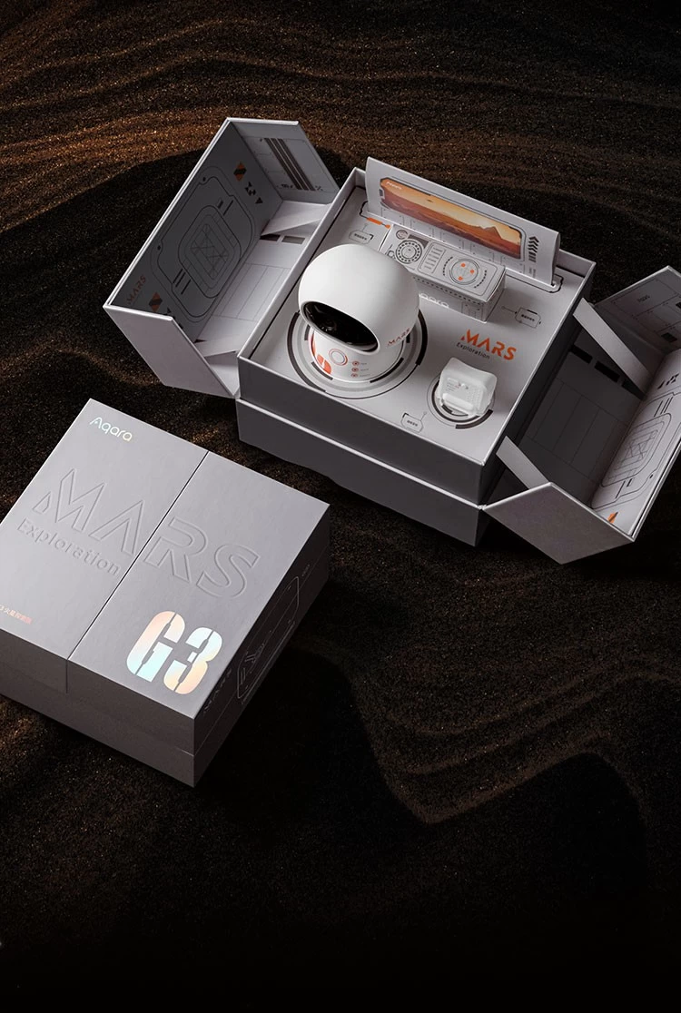 Aqara 智能摄像机 G3 火星探索版包装采用独特的升降台设计,模拟火星登陆舱设计,巧妙的自动升降装置,营造出置身太空中的感觉。在整体为灰色的包装盒之间隐约露出的烫金公益的金属镭射效果。如同在空寂宇宙中看到橙红色的火星,沉稳内敛中平添浪漫神秘。打开Aqara 智能摄像机 G3 火星探索版就仿佛置身于火星探索一般,感受它的神秘与美丽。