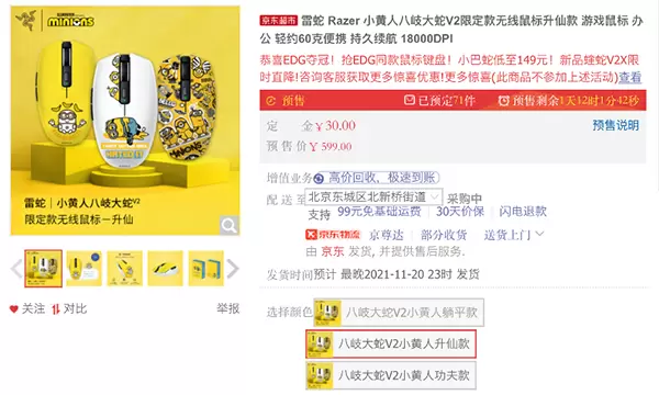 在2021年《英雄联盟》全球总决赛S11上,EDG战队成功夺冠,备受关注的不只是战队和选手, 京东电脑数码“EDG同款”外设产品的热度也持续走高。众所周知,EDG全队都是使用雷蛇产品,其中,雷蛇Razer小黄人八岐大蛇V2限定款无线鼠标升仙款,凭借不足60克的轻量外形、RAZER HYPERSPEED低延迟无线技术、像素级的精确瞄准能力、至高950小时的持久续航,为EDG战队在赛场上的精彩表现提供了可靠支持。目前该款鼠标已在京东11.11发售,手持EDG冠军同款外设,分享冠军喜悦的同时,创造自己的荣耀巅峰时刻。