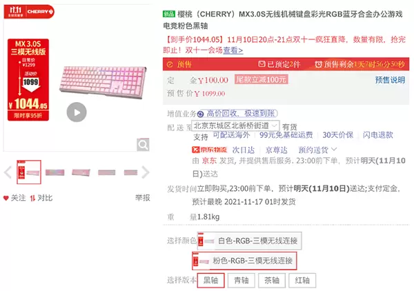 CHERRY樱桃MX 3.0S无线机械键盘,三模无线连接,多平台、多设备无缝切换自由连接,让用户操作得心应手,基于自研技术CAWT,实现低于1ms的疾速响应,配合上全键无冲,一体成型的阳极氧化铝制底壳,经典的无钢板设计,以及1600万色个性化的RGB灯效调控等,无论是办公、家用还是娱乐都能契合用户需求。京东11.11限时享95折,数量有限,抢完即止。