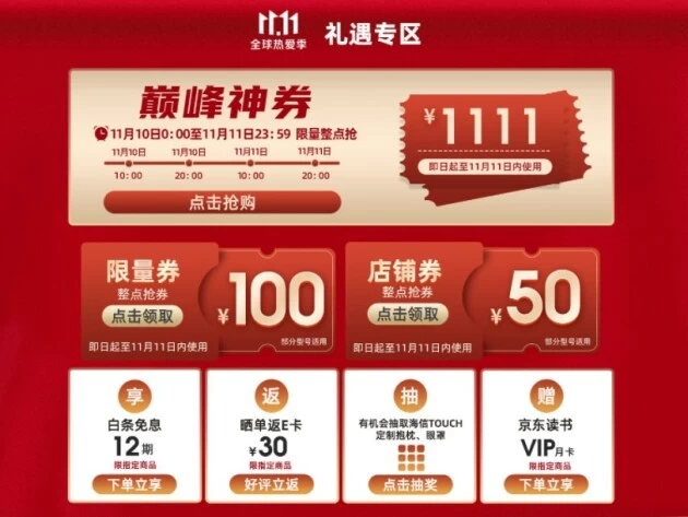 即日起至11月11日,大家可在海信手机京东自营旗舰店领取50元/100元优惠券;参加惊喜抽奖活动;更令人兴奋的是,11月10日和11月11日的上午10:00与下午20:00都有1111元巅峰神券开抢,机会难得不容错过~