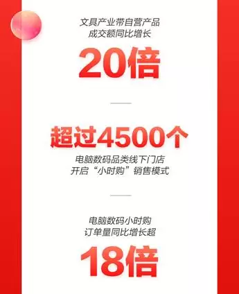 作为京东全渠道布局的重要一环,京东电脑数码店契合用户即时消费需求,再次刷新服务时效和规模,消费体验全面升级。11月10日晚20点,超4500个电脑数码品类线下门店开启“小时购”销售模式,开场仅10分钟,电脑数码小时购订单量同比增长超18倍,创下历史新战绩。与此同时,在拉动区域经济增长方面,京东电脑数码增长引擎作用再度发力,拉动文具产业带自营产品成交额同比增长20倍。