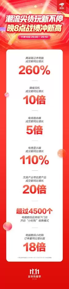从整体战绩不难看出,京东电脑数码依靠持续为消费者带来的品质好物和贴心服务,依旧牢牢占据着用户心智,推动着消费升级新体验。而京东11.11高潮日晚8点瞬时爆发的亮眼战绩,折射出消费升级浪潮下,京东对满足消费者高端新品消费、电竞潮流体验等品质生活的更高追求,也彰显出推动产业带商家转型、进一步激活消费市场活力的澎湃动力。