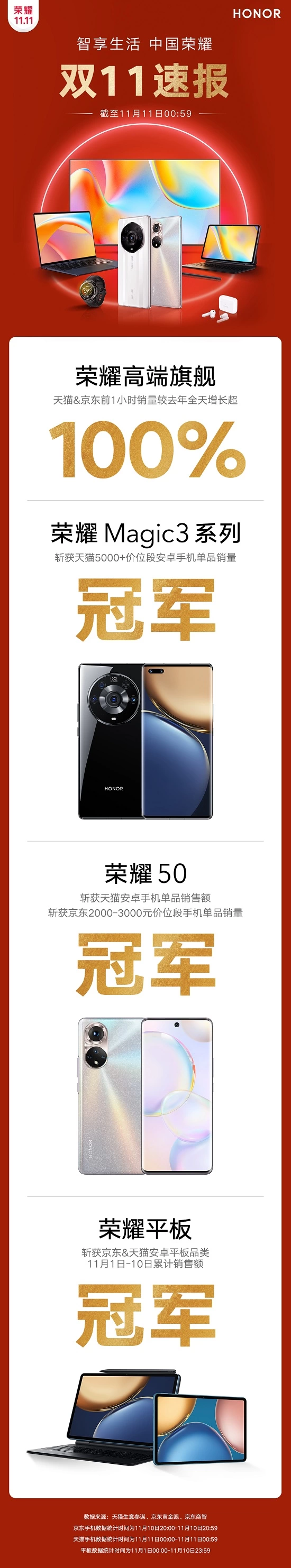 截至11月11日00:59,荣耀手机和智慧全场景产品再夺喜人成绩。荣耀天猫、京东高端旗舰前1小时销量较去年全天增长超100%,荣耀Magic3系列获天猫5000+价位段安卓手机销量冠军,荣耀50获天猫平台手机品类安卓单品销售额冠军、京东平台手机品类2000-3000价位段单品销量冠军。