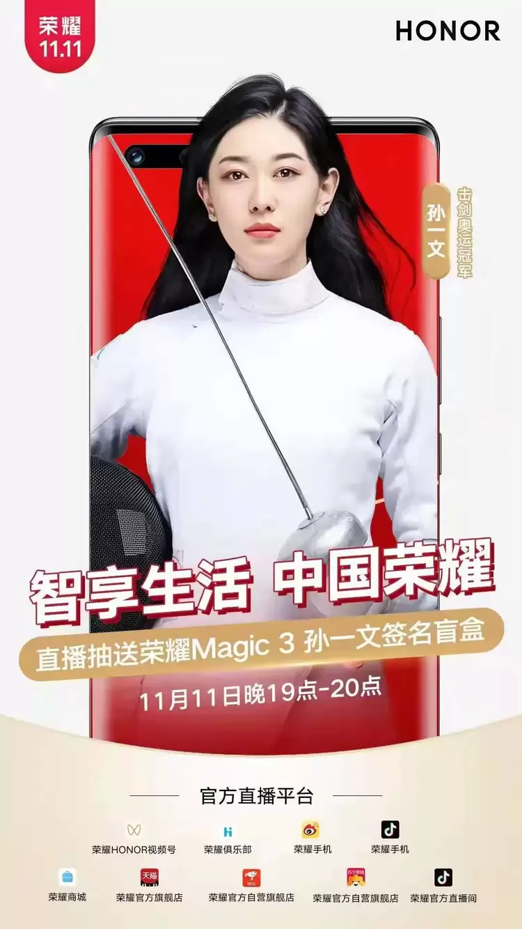 今晚(11月11日)19点-20点,荣耀将携手击剑奥运冠军孙一文,带来全能科技旗舰荣耀Magic3系列及智慧全场景产品相关直播,分享赛场内外制胜之道。在本次直播活动中,还将抽送孙一文签名盲盒、荣耀Magic3手机等好礼,这场冠军加持的双11终极直播,必不能错过。