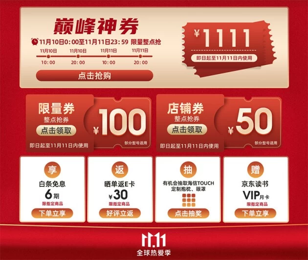 即日起至11月11日,众多爆款产品不仅大幅直降,还有巅峰神券及多项好礼赠送,高达1111元的空前大额券限量开闸,同时集合百元优惠券、店铺抽奖,高达12期的白条免息和一年的京东读书VIP等超燃回馈项,提前引爆了大促制高点。