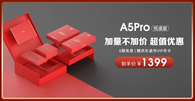 本身性价比尤为突出的海信A5 Pro CC版在本次活动中更为炙手可热,其配备了4096色彩墨屏,不仅阅读效果亮彩舒适,同时拥有文字抗锯齿修复技术、AI图像处理算法以及屏幕极速响应技术,带来更加清晰的显示效果,杜绝高延时残影,出彩护眼与流畅阅读兼优。该产品阅读礼盒版套装加送网易云氧气耳机、网易黑胶会员、定制保护壳等众多超值大礼,活动期间直降400元,叠加百元优惠券后到手价仅1399元,京东读书VIP和白条免息一并附送。
