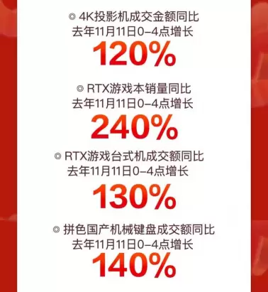 曾几何时,人们习惯了被快节奏的工作和生活裹挟向前;而如今,越来越多的人开始意识到,慢下来,借助娱乐减压释怀、学会享受生活也是重要一课,这一点从京东11.11高潮日战报便可见一斑。开场仅4小时,大屏追剧更沉浸的4K投影机成交额同比增长120%。EDG夺冠则让电竞装备再次迎来消费热,RTX游戏本销量同比增长240%,RTX游戏台式机成交额同比增长130%。此外,拼色国产机械键盘成交额同比增长140%,消费者对国货产品的信赖与支持,成为带动其销售增长的重要力量。