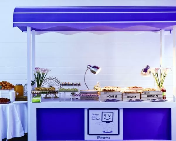 本次VeSync快闪店的整体展区设计以具有品牌辨识度的紫色作为主色调,搭配上小喂管家符号化的治愈卡通形象,尽显未来主义的科技色彩,一经亮相,就吸引了不少苏宁人前来打卡。本次快闪店分为三个区域:夜宵美食享用区、休闲茶歇打卡区、产品体验区。