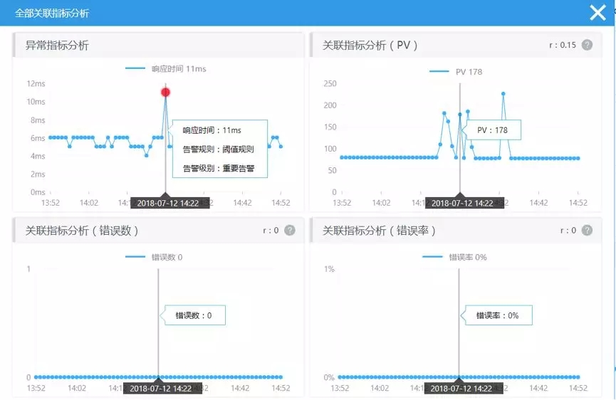 理论依据:当某一个维度的指标发生异常时,那么相关的其他指标也极有可能一定程度上体现出正向或反向的波动,如果可以将多个疑似相关指标的曲线在一个图上展示,并提供格线比对功能,那么相比于传统的翻阅日志看log的情况,将会更快的定位到问题的原因。