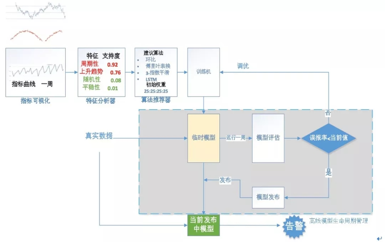 离线算法训练模块要根据历史数据来以离线的方式训练和修正算法模型,然后生成的算法模型就类似于一个个的[if else]判断形成的规则组合,当最新的数据输入到算法模型,就可以实时的给出推测,用于预测、异常检测、故障定位等场景,这里面当然就需要机器学习和深度学习的算法来撑场面了。