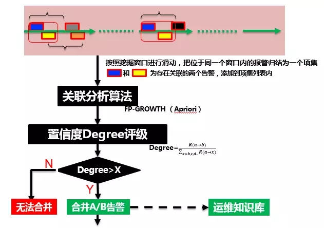 采用机器学习算法实现告警的关联挖掘,进而实现告警前的合并优化,与告警后的数据分析,反哺合并策略。