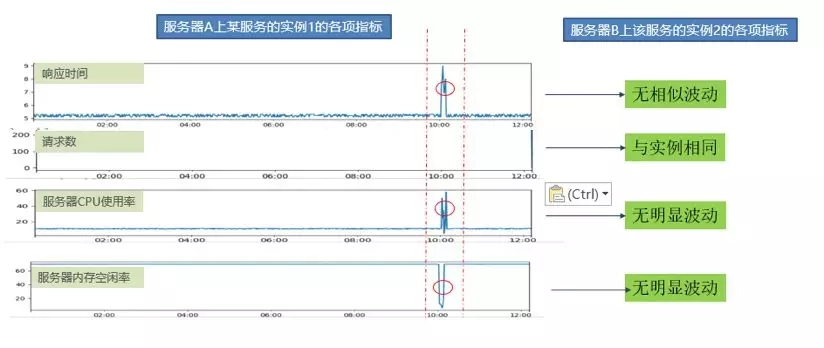 落地场景:如上图所示,某服务器上某服务实例在10:00左右发生了响应时间严重变慢的情况,经过对相同服务器的各项指标分析,可知当时系统CPU占用在同一时刻上升,且内存的空闲率也大幅下降,但是实际的业务访问量并没有飙升,说明并非业务繁忙导致,疑似服务器硬件问题所致;同时在针对部署在服务器B上的相同实例的指标进行对比,发现各项指标并无明显波动,且和服务器B上正常指标类似,所以可以确定是因为服务器A的硬件问题导致,完成故障初步定界,继而再去排查服务器的相关指标,便可迅速定位问题。