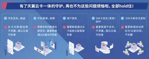 天翼云卡一体备份功能,让许多棘手的难题迎刃而解:在手机丢失、被盗的情况下,云卡内数据因经过加密不会被泄露,同时用户也可通过云盘找回数据;如果手机遇到黑屏、故障,即使手机内数据全部丢失,重要数据也可通过云盘恢复;在SIM卡丢失、更换、损坏或被非法复制的情况下,存储在卡中的重要数据也无法被窃取泄露,用户可成功恢复;此外,在换机过程中,重要数据还可通过云卡一体备份轻松迁移到新机。