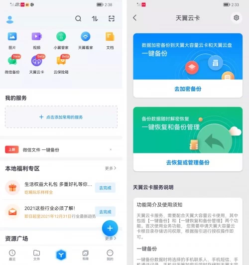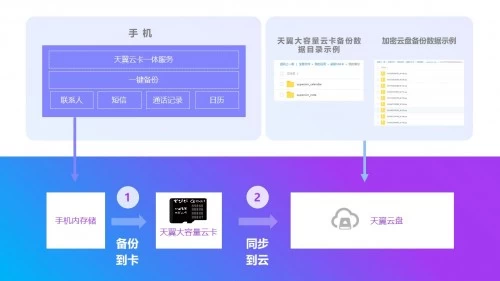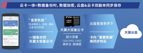 中国电信天翼云卡一体服务,是天翼云盘结合天翼大容量云卡,打造出云卡一体的备份能力。用户通过天翼云盘,将用户手机的联系人、短信、通话记录和日历等重要数据加密存储在天翼大容量云卡上,同步保存到天翼云盘中。云卡和云盘双副本备份,防丢失、防泄漏、防篡改,为用户的数字资产提供了坚实的守护。