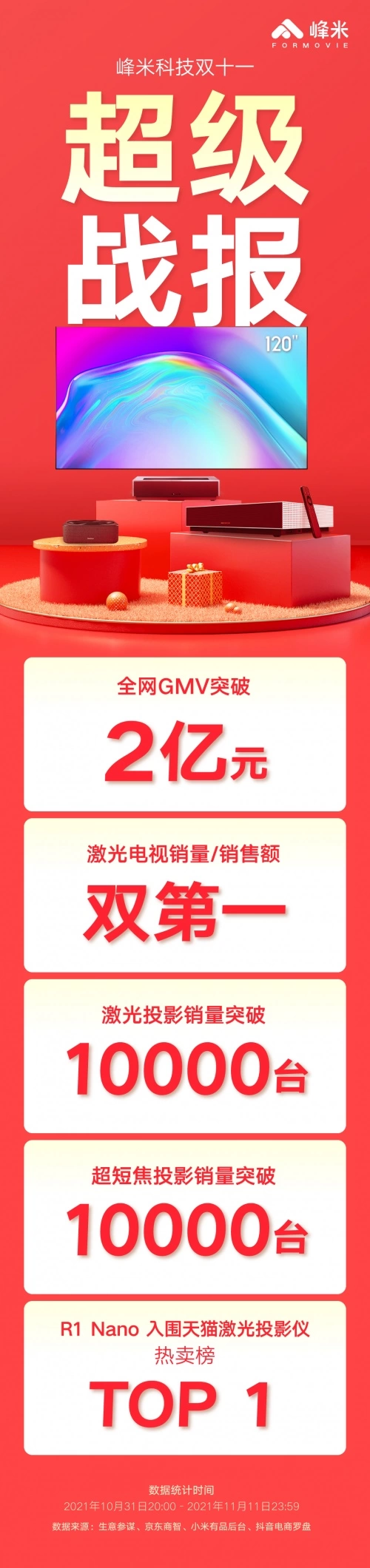 11月11日晚24点,双十一完美收官。峰米科技(以下简称“峰米”)刷新纪录,再创多项佳绩。峰米全网GMV破2亿,强势再夺激光电视线上销售额和销量双料冠军,自2018年起达成四连冠!此次获得的耀眼战绩,再一次证明了峰米品牌在激光投影行业的领军地位和来自消费者的品质认可。