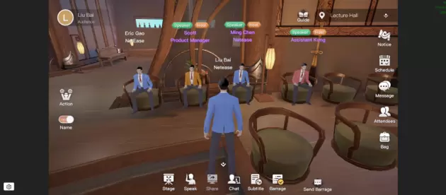 同时,为了增强会议的互动性和体验感,“瑶台”不仅同步实现了 PPT 嵌入式播放、文字和语音聊天、同声翻译、多个分会场自由切换等数十项会议功能,而且为了满足了会议社交需求,无需加群,虚拟人见面就能开启群聊。