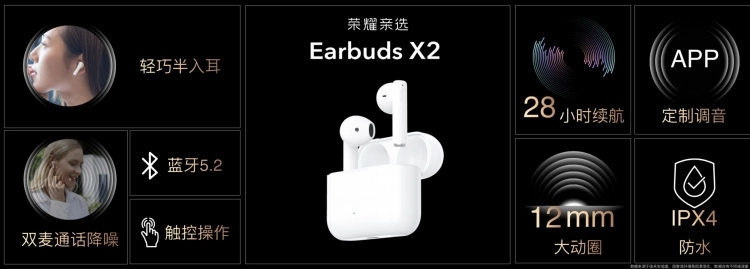 荣耀亲选Earbuds X2耳机搭载最新蓝牙5.2,凭借超越同级别产品的AI通话降噪、超28小时续航、SAW抗干扰,成为入门级TWS耳机首选。DNN神经网络通话降噪算法可以全面提升通话质量,带来更加稳定可靠的体验。