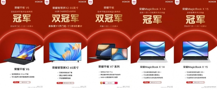 2021双十一落下帷幕,在这场重要的擂台赛上,荣耀智慧生活以优异成绩通过了年度大考:荣耀平板V6荣获京东平台开门红-11月11日安卓平板单品累计销售额冠军,荣耀平板7获天猫平台11月1日~11月11日安卓平板单品累计销量&销售额双冠军,荣耀平板斩获安卓平板类销量&销售额双冠,荣耀MagicBook X 15荣获京东平台开门红-11月11日轻薄本累计销量冠军,荣耀MagicBook X 14获京东双11当日轻薄本单品销量冠军。