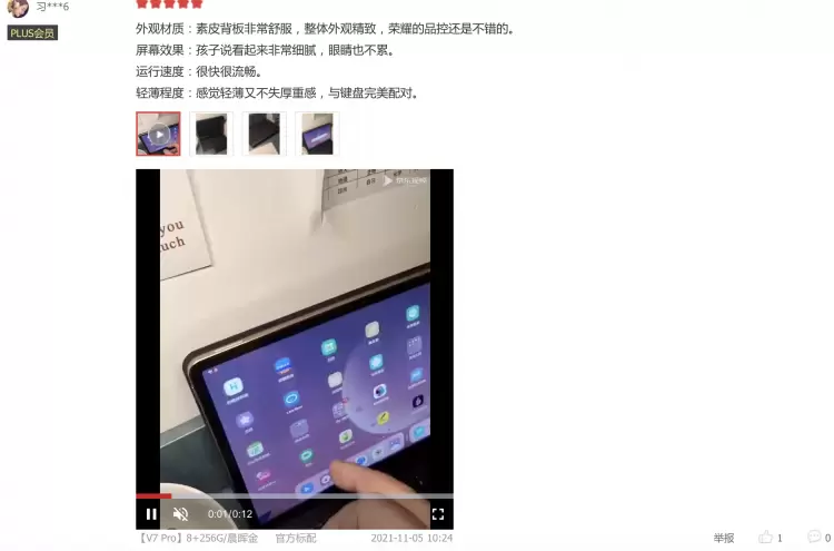 作为荣耀智慧生活的重要一环,荣耀在平板领域持续深耕,实现了业内首屈一指的生态体验和影音表现,为消费者提供更为多元的选择和体验。更重要的是,荣耀还打破系统底层之间的壁垒,实现平板和笔记本的多屏协同,开安卓平板之先风,使之真正成为辅助用户办公的生产力工具,大幅提升用户体验。 用户留言道,“荣耀平板很快很流畅,看起来非常细腻,眼睛也不累”。