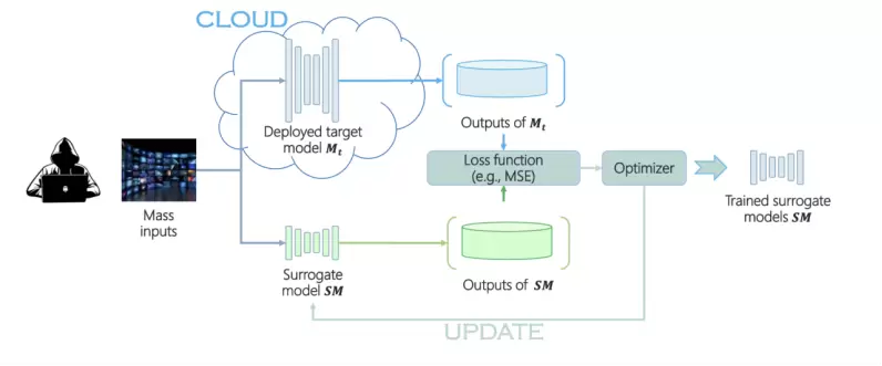 在模型窃取方式中,代理模型攻击是一种典型的手段,它通过训练与原模型功能相似的代理模型来蒸馏原模型的知识——将原模型的输入作为其输入,原模型的输出作为其训练标签,并进行参数优化,不断拟合原模型的输出,最终达到窃取原模型知识的目的。