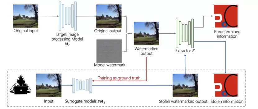 这套方法可以在预先防护阶段,生成肉眼不可见的水印,并将之添加到原模型的输出上,为原模型的输出“烙上”版权信息,同时,对原模型的输出几乎不产生影响。当AI模型被攻击时,其附带的水印也会被代理模型学习到,进而使得代理模型的输出中也含有该水印。