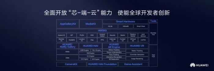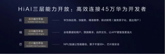 在芯片侧,华为将通过HiAI移动计算平台、影音工具、游戏助手等打造流畅的操作体验;在终端侧,华为通过智慧硬件、HiAI平台、AR/VR等设备来构筑全连接服务和全场景应用,提供一系列智能感知和交互能力;在云侧则通过华为移动服务(HMS)、AppGallery等满足消费者个性化的使用需求。