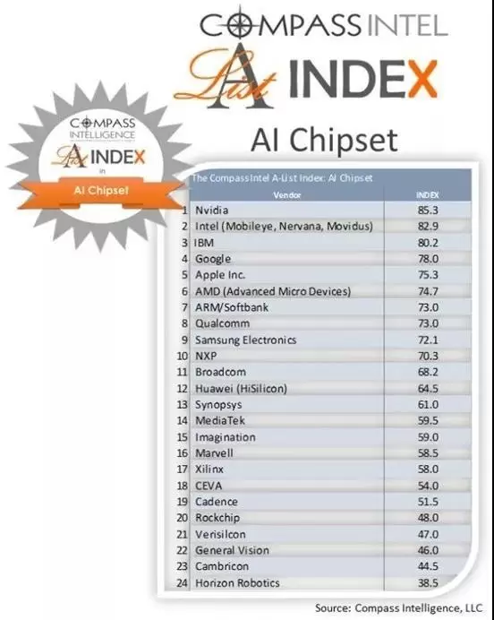 下面这张图是Compass Intelligence公布的全球AI芯片榜单。因为AI芯片目前在终端应用极少,所以榜单头部的排名可以近似的认为就是云端AI芯片的目前市场格局。