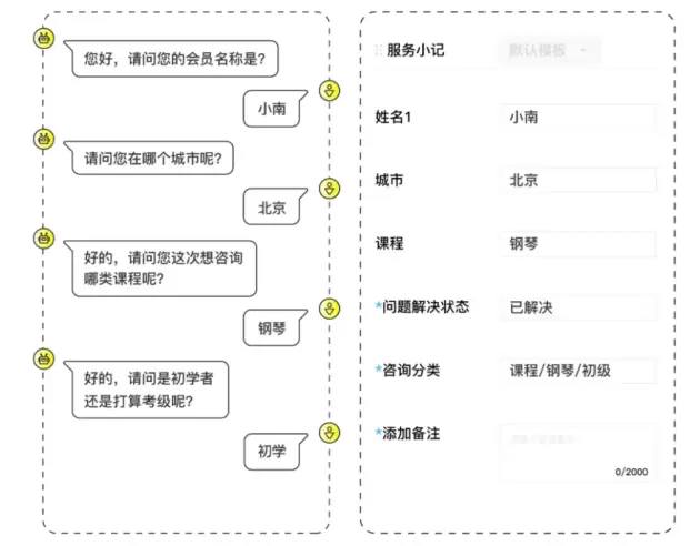 对于不少客服来说,在接待完访客后有填写服务小记的规范要求,通过服务小记的咨询分类,来帮助日常咨询业务复盘。此前机器人只能保留记录对话,而并不能自动生成服务小记,所以当机器人无法解决访客问题转人工时,人工客服需要自己手动翻阅相关对话内容,不能立刻掌握访客咨询信息。