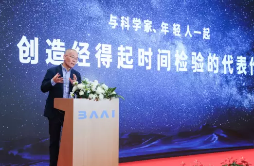 活动现场,智源研究院院长黄铁军分享了智源研究院过往三年的成就。成立之初,智源研究院明确要聚焦原始创新和核心技术,在北京建成全球最佳的人工智能创新生态,围绕这一目标,并沿着人工智能技术的发展轨迹,智源研究院将“炼大模型”、打造高精度生命模拟平台等作为技术路径,三年来不断探索,形成了独特的“智源模式”。