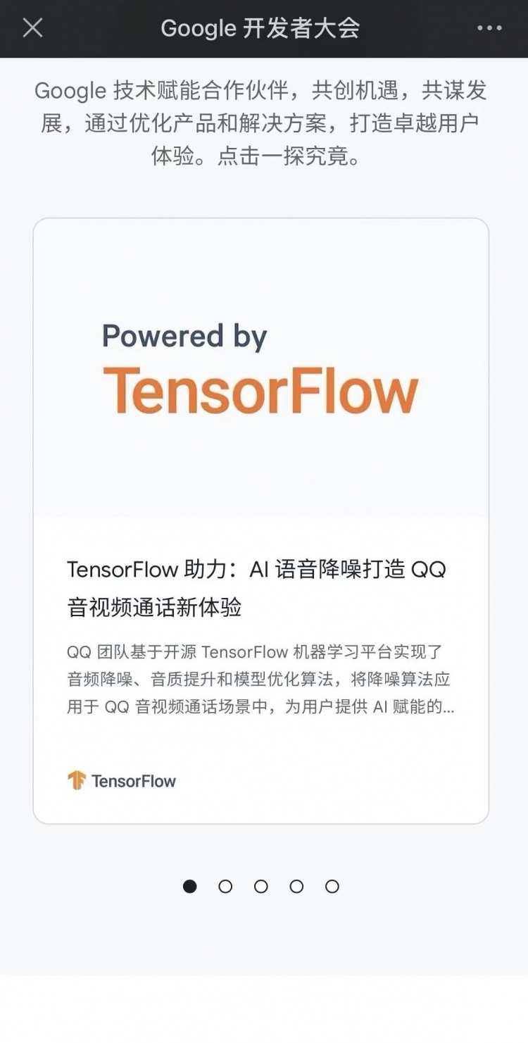 今年11月16日召开的谷歌2021开发者大会期间,大会官网更新了一则案例——《TensorFlow助力:AI语音降噪打造QQ音视频通话新体验》,作者正是QQ音视频通话技术团队。作为谷歌TensorFlow的优秀应用案例,腾讯QQ团队在该文中详细揭秘了语音增强技术在QQ音视频功能中的研发与应用。