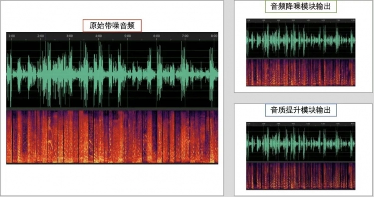 音频降噪模块主要是通过针对带噪声音频中的干净人声进行建模,再提取出带噪音频的频域特征,将带噪声音频与干净音频的的频域特征进行对比和计算,从而使AI对人声之外常见的开门声、键盘声、走路声等音频具备更精准的识别能力和降噪处理,从嘈杂环境中剥离出干净语音。