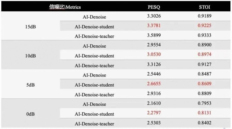 测试结果显示,短时目标清晰度(STOI)与语音质量的感知评估(PESQ)均有所提升,并且随着降噪量的提升,AI降噪效果的优势还能进一步凸显。