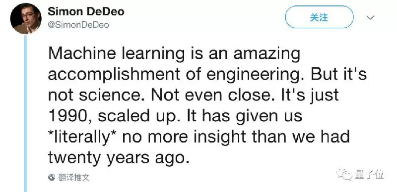 机器学习是一个了不起的工程成就。但这不是科学,远远不是。这技术现在所做的事情,跟1990年没什么差别,顶多就是规模更大,但并没有给我们带来比20年前更深刻的见解。