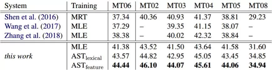 可以看到,研究者使用极大似然估计(MLE)训练的 NMT 系统优于其它最好模型大约3 BLEU。