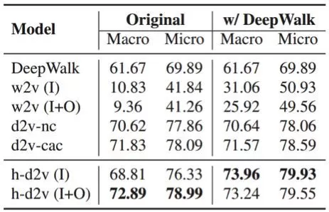 可以看到,添加了 DeepWalk 信息后基本都能得到更优的结果;而不管是否使用了 DeepWalk,hyperdoc2vec的结果都是最优的。