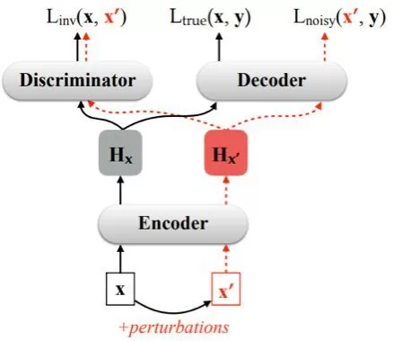 上图给出了该方法的架构示意,其工作过程为:给定一个输入句子x,首先生成与其对应的扰动输入x',接着采用对抗训练鼓励编码器对于x 和x' 生成相似的中间表示,同时要求解码器端输出相同的目标句子y。这样能使得输入中的微小扰动不会导致目标输出产生较大差异。