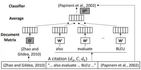 为此,研究者提出了一种新的嵌入模型hyperdoc2vec。不同于大多数已有方法,hyperdoc2vec会为每个超文档学习两个向量,以表征其引用其它文档的情况和被引用的情况。因此,hyperdoc2vec可以直接建模超链接或引用情况,而不损失其中包含的信息。下面给出了hyperdoc2vec 模型示意图: