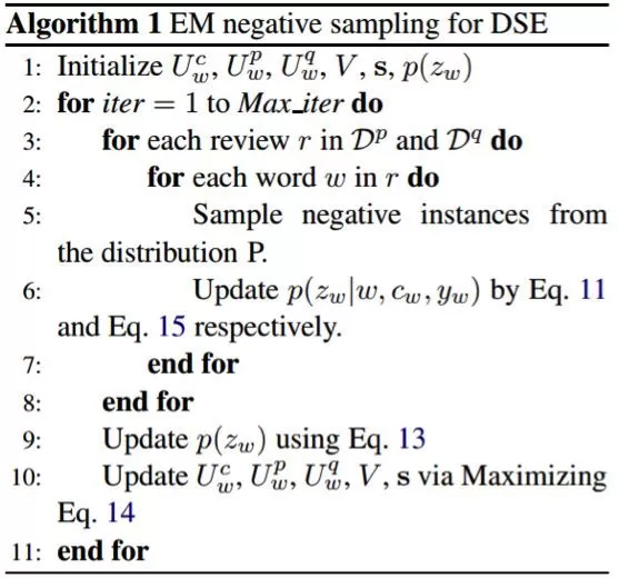 在 DSE 模型中,研究者为词汇表中的每个词都设计了一个用于描述该词是领域无关词的概率的分布。这个概率分布的推理是根据所观察的情感和上下文进行的。具体而言,其推理算法结合了期望最大化(EM)方法和一种负采样方案,其过程如下算法1 所示。