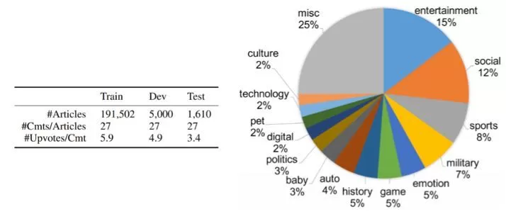 研究者爬取了 2017 年 4 月到 8 月的新闻文章及相关内容,然后使用Python 库Jieba 对所有文本进行了token 化,并过滤掉了文本少于 30 词的短文章和评论数少于 20 的文章。所得到的语料又被分成了训练集、开发集和测试集。该数据集的词汇库大小为1858452。文章标题和内容的平均长度分别为 15 和 554 中文词(不是汉字)。平均评论长度为17 词。辅助信息方面,每篇文章都关联了44 个类别中的一个。每条评论的点赞数量平均在 3.4-5.9 之间,尽管这个数字看起来很小,但该分布表现出了长尾模式——受欢迎的评论的点赞数可达成千上万。