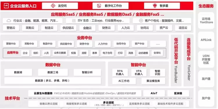 低代码开发平台和连接集成平台、 YonStore 等生态服务,则进一步覆盖了客户的其他需求,以高度灵活的定制服务,最大程度适配客户的业务场景,形成场景化服务的闭环。