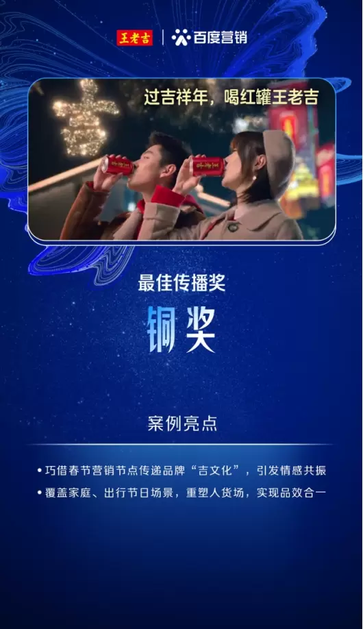 春节一直都是各品牌争夺的主战场,也是王老吉高度重视的营销节点。王老吉洞察到,春节核心人群无非两类,一类“在路上”,一类“在家里”。基于这一洞察,王老吉携手百度营销,借助百度地图、小度两大搭载百度AI技术的产品,充分抢占用户心智,让大家走亲访友时都能带上王老吉,传递品牌“吉文化”,实现品效合一。