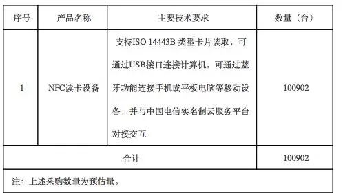 公告称,此次项目采购内容为中国电信集团有限公司和中国电信股份有限公司及其下属的子公司、分公司2018年至2019年所需NFC读卡设备。另外,中国电信要求集采的设备要支持ISO14443B 类型卡片读取,可通过USB接口连接计算机,可通过蓝牙功能连接手机或平板电脑等移动设备,并与中国电信实名制云服务平台对接交互。