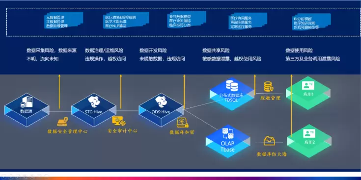 作为一个透明的管理工具,腾讯医疗数据中台将数据资产的操作纳入到了监控范围,例如,安全管理中心模块通过元数据、主数据、数据血缘,实现了数据源的链路可追溯;安全审计中心连接用户权限管理中心,使数据安全管理与隐私管理相配合,并在维护数据权限的同时,记录每一次的越权尝试,在任何数据出现异动时都会作出记录与预警;由堡垒机与防火墙构建起的数据应用层安全保障,则为数据使用把控风险。