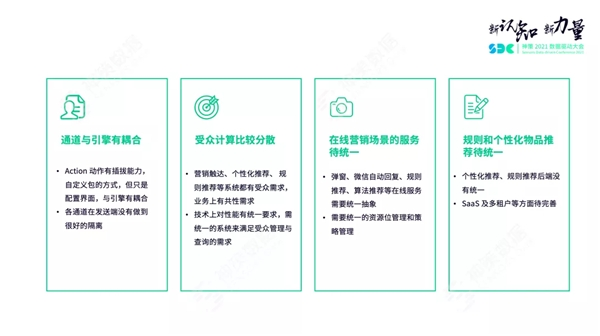在线营销场景的服务待统一:在线请求层面有弹窗、微信自动回复、推荐等在线服务需要统一抽象;对在线场景需要统一的离线的资源位管理和策略管理。