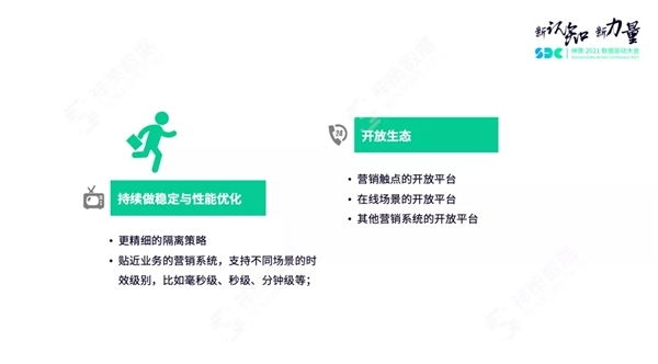 在接下来的平台化规划中,我们将从稳定与性能优化、开放生态两方面持续迭代,具体包括打造更精细的隔离策略、贴近业务的营销系统,以及营销触点的开放平台、在线场景的开放平台等。如下图所示: