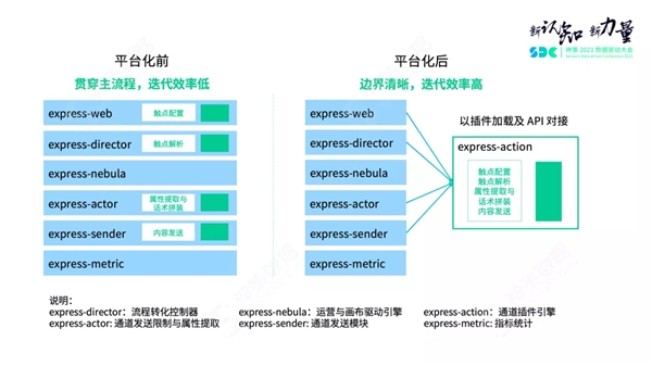 触达通道引擎在平台化之前,贯穿主流程,迭代效率比较低。比如说 Express-Web,用来配置营销内容,对于新类型的触点需要开发配置界面;Express-Director 是流程转化控制器,对于新类型的触点需要开发获取配置的特定逻辑,Express-Nebula 是画布驱动和事件计算引擎,设计之初就比较组件化,没有业务关联的改造;Express-Actor 需要为每类通道提取话术属性,需要有单独的开发;Express-Sender 需要为每类通道做对应的发送,有对应的开发和调试。