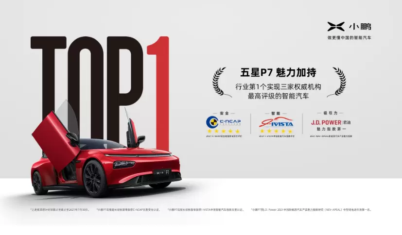 小鹏P7获得C-NCAP、i-VISTA、J.D.Power最高成绩认证